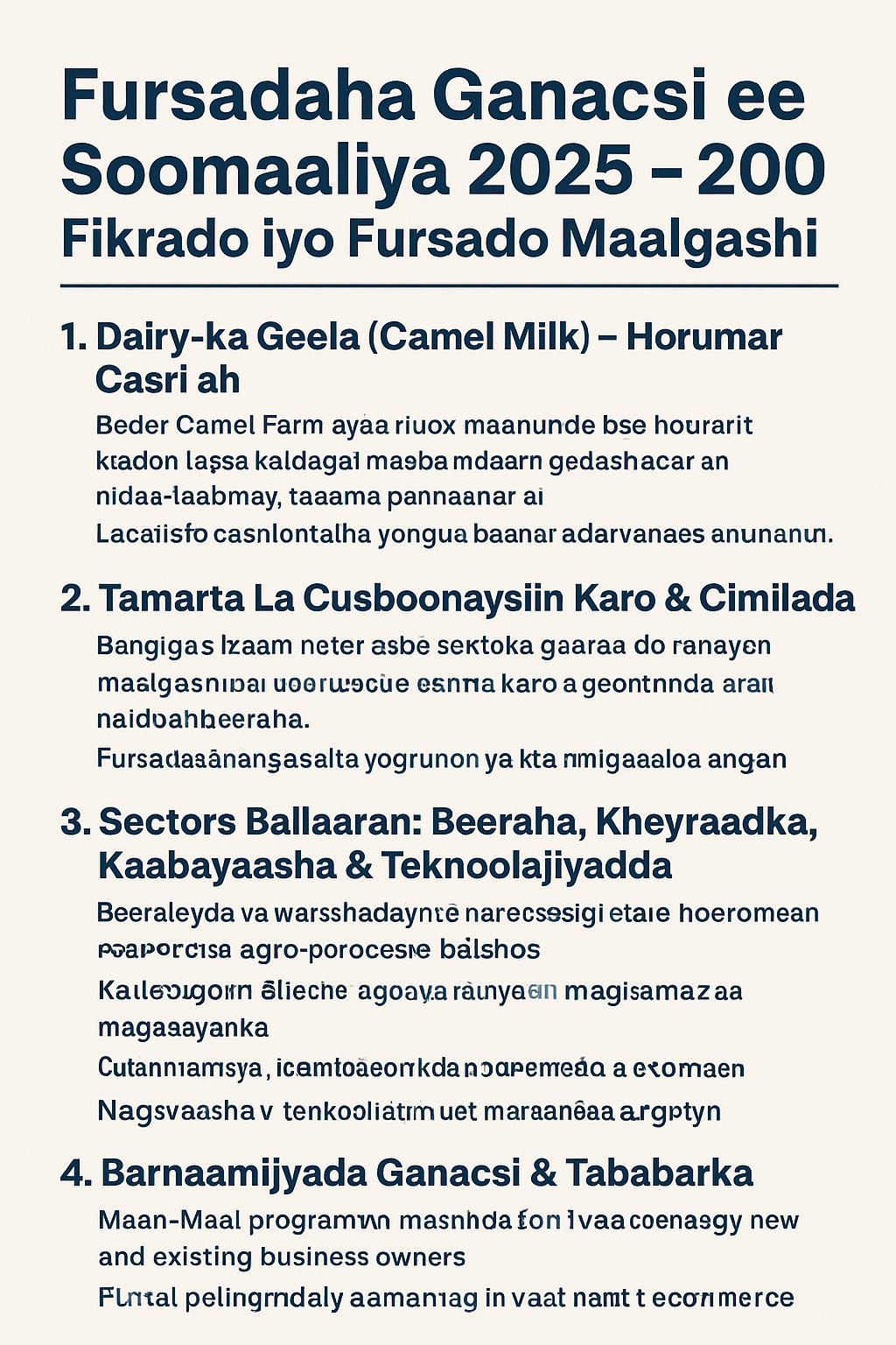 ** Fursad:** Ganacsi geela lagu casriyeeyo—soo saarista caano, yoghurt, iyo alaabooyin kale oo nafaqo leh—waa mid leh suuq gudaha iyo suurogalka dhoofinta.https://rankmath.com/kb/score-100-in-tests/?utm_source=Plugin&utm_medium=Content%20Analysis%20Single%20Test%20KB&utm_campaign=WP#focus-keyword-in-the-url-primary-focus-keyword-only